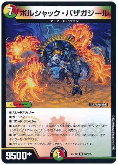 スピードアタッカーガードマンパワード・ブレイカーエスケープ(このクリーチャーが破壊される時、墓地に置くかわりに自分のシールドを1つ手札に加えてもよい。ただし、その「S・トリガー」は使えない)自分の墓地にある、名前に《ボルシャック》とあるカード1枚につき、このクリーチャーのパワーを+3000する。相手のクリーチャーがタップした時、このクリーチャーをアンタップする。