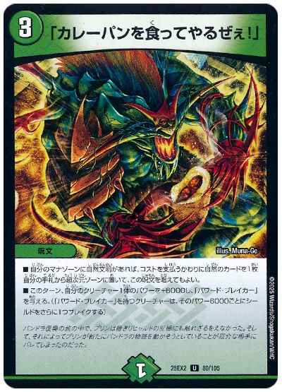 自分のマナゾーンに自然文明があれば、コストを支払うかわりに自然のカードを1枚自分の手札から超次元ゾーンに置いて、この呪文を唱えてもよい。このターン、自分のクリーチャー1体のパワーを+6000し、「パワード・ブレイカー」を与える。(「パワード・ブレイカー」を持つクリーチャーは、そのパワー6000ごとにシールドをさらに1つブレイクする)
