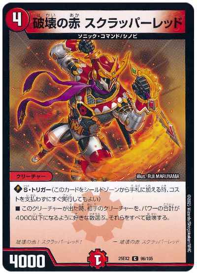 S・トリガー(このカードをシールドゾーンから手札に加える時、コストを支払わずにすぐ実行してもよい)このクリーチャーが出た時、相手のクリーチャーを、パワーの合計が4000以下になるように好きな数選ぶ。それらをすべて破壊する。