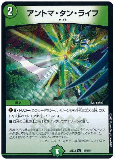 S・トリガー(このカードをシールドゾーンから手札に加える時、コストを支払わずにすぐ実行してもよい)自分の山札の上から1枚をタップしてマナゾーンに置く。