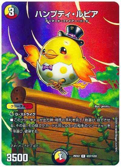 G・ストライクこのクリーチャーが出た時、相手の手札を見て1枚選び、捨てさせる。その後、その捨てたカードと同じコストの相手のクリーチャーを1体選び、破壊する。