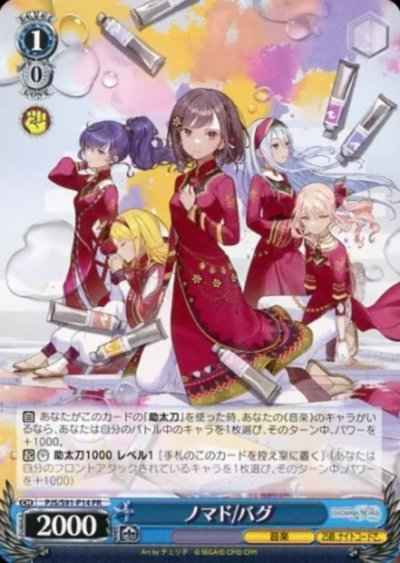 【自】 あなたがこのカードの『助太刀』を使った時、あなたの《音楽》のキャラがいるなら、あなたは自分のバトル中のキャラを1枚選び、そのターン中、パワーを+1000。 【起】【カウンター】 助太刀1000 レベル1 [手札のこのカードを控え室に置く] (あなたは自分のフロントアタックされているキャラを1枚選び、そのターン中、パワーを+1000)