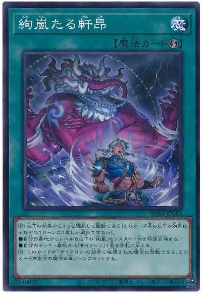 (1):以下の効果から1つを選択して発動できる(このカード名の以下の効果はそれぞれ1ターンに1度しか選択できない)。●自分の墓地からレベル6以下の「絢嵐」モンスター1体を特殊召喚する。●自分のデッキ・墓地から「サイクロン」1枚を手札に加える。(2):このカードが「サイクロン」の効果で破壊された場合に発動できる。このカードを自分の魔法&罠ゾーンにセットする。