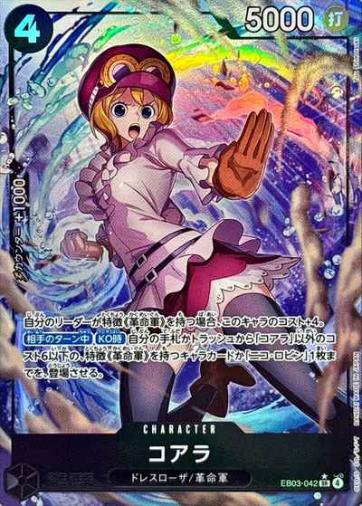 【相手のターン中】【KO時】自分の手札かトラッシュから「コアラ」以外のコスト6以下の、特徴《革命軍》を持つキャラカードか「ニコ・ロビン」1枚までを、登場させる。