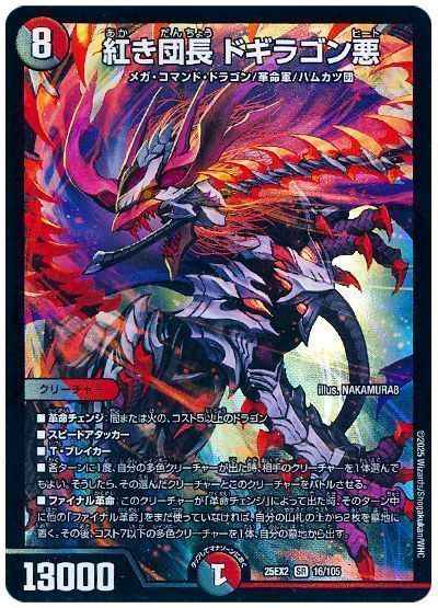 革命チェンジ:闇または火の、コスト5以上のドラゴンスピードアタッカーT・ブレイカー各ターンに1度、自分の多色クリーチャーが出た時、相手のクリーチャーを1体選んでもよい。そうしたら、その選んだクリーチャーとこのクリーチャーをバトルさせる。ファイナル革命:このクリーチャーが「革命チェンジ」によって出た時、そのターン中に他の「ファイナル革命」をまだ使っていなければ、自分の山札の上から2枚を墓地に置く。その後、コスト7以下の多色クリーチャーを1体、自分の墓地から出す。
