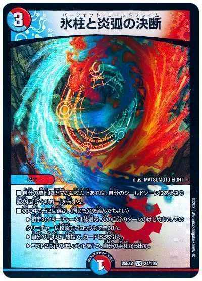 自分の墓地に呪文が2枚以上あれば、自分のシールドゾーンにあるこの呪文に「S・トリガー」を与える。次の中から2回選ぶ。(同じものを選んでもよい)?相手のクリーチャーを1体選ぶ。次の自分のターンのはじめまで、そのクリーチャーは攻撃もブロックもできない。?自分の手札を1枚捨て、カードを2枚引く。?コスト2以下のエレメントを1つ、自分の手札から出す。