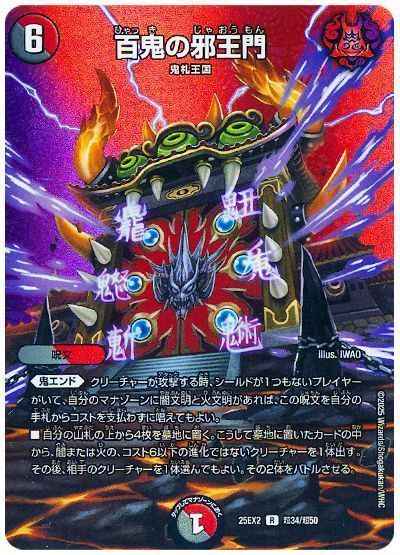 <鬼エンド>クリーチャーが攻撃する時、シールドが1つもないプレイヤーがいて、自分のマナゾーンに闇文明と火文明があれば、この呪文を自分の手札からコストを支払わずに唱えてもよい。自分の山札の上から4枚を墓地に置く。こうして墓地に置いたカードの中から、闇または火の、コスト6以下の進化ではないクリーチャーを1体出す。その後、相手のクリーチャーを1体選んでもよい。その2体をバトルさせる。