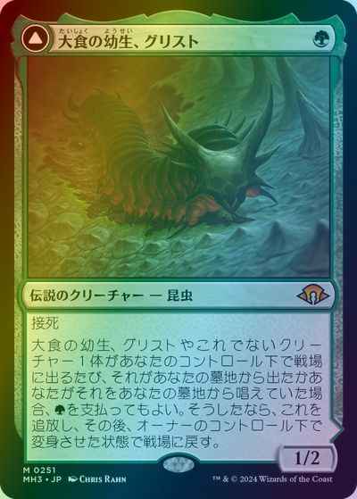 接死 大食の幼生、グリストやこれでないクリーチャー1体があなたのコントロール下で戦場に出るたび、それがあなたの墓地から出たかあなたがそれをあなたの墓地から唱えていた場合、(緑)を支払ってもよい。そうしたなら、これを追放し、その後、オーナーのコントロール下で変身させた状態で戦場に戻す。/[+1]:黒緑の1/1の昆虫(Insect)クリーチャー・トークン1体を生成し、その後、カード2枚を切削する。これにより黒のカードが切削されたなら、そのトークンの上に接死カウンター1個を置く。 [-2]:アーティファクトやエンチャントである1つを対象とする。それを破壊する。 [-6]:あなたの墓地にある各クリーチャー・カードにつきそれぞれ、黒緑の1/1の昆虫であることを除きそれのコピーであるトークン1体を生成する。