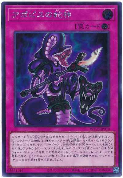 このカード名の(1)(2)の効果はそれぞれ1ターンに1度しか使用できない。(1):このカードは発動後、通常モンスター(爬虫類族・地・星4・攻1600/守1800)となり、モンスターゾーンに特殊召喚する(罠カードとしても扱う)。その後、デッキから「アポピスの蛇神」以外の「アポピス」罠カード1枚を自分フィールドにセットできる。この効果でセットしたカードはセットしたターンでも発動できる。(2):このカードが墓地へ送られた場合に発動できる。デッキから「アポピスの化神」1枚を手札に加える。