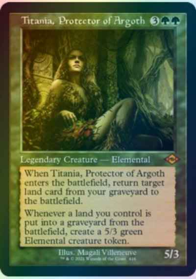 When Titania, Protector of Argoth enters the battlefield, return target land card from your graveyard to the battlefield.