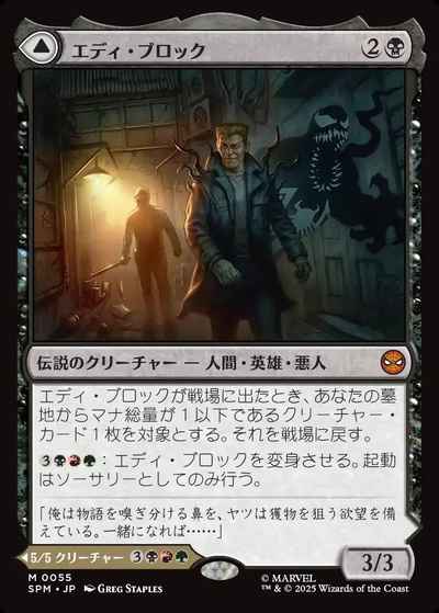 エディ・ブロックが戦場に出たとき、あなたの墓地からマナ総量が1以下であるクリーチャー・カード1枚を対象とする。それを戦場に戻す。 (3)(黒)(赤)(緑):エディ・ブロックを変身させる。起動はソーサリーとしてのみ行う。/威迫、トランプル、速攻 これが攻撃するたび、これでないクリーチャー1体を生け贄に捧げてもよい。そうしたなら、カードX枚を引き、その後、あなたの手札からマナ総量がX以下であるパーマネント・カード1枚を戦場に出してもよい。Xは、その生け贄に捧げられたクリーチャーのマナ総量に等しい。