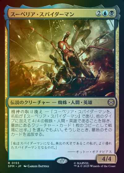 精神の取り換え ― 「スーペリア・スパイダーマンを、名前が《スーペリア・スパイダーマン/Superior Spider-Man》であり、他のタイプに加えて4/4の蜘蛛(Spider)・人間(Human)・英雄(Hero)であることを除き、墓地にあるクリーチャー・カード1枚のコピーとして戦場に出す。」を選んでもよい。そうしたとき、墓地のそのカードを追放する。