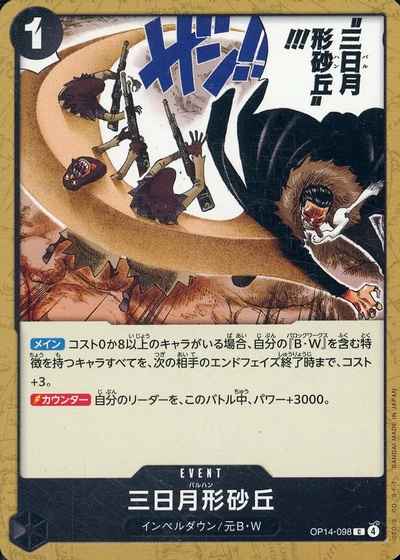 【メイン】コスト0か8以上のキャラがいる場合、自分の『B・W』を含む特徴を持つキャラすべてを、次の相手のエンドフェイズ終了時まで、コスト+3。 【カウンター】自分のリーダーを、このバトル中、パワー+3000。