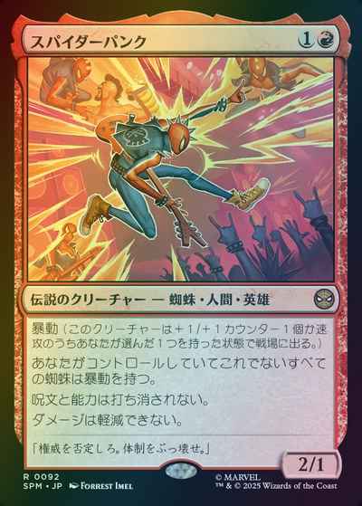 暴動(このクリーチャーは+1/+1カウンター1個か速攻のうちあなたが選んだ1つを持った状態で戦場に出る。) あなたがコントロールしていてこれでないすべての蜘蛛(Spider)は暴動を持つ。 呪文と能力は打ち消されない。 ダメージは軽減できない。