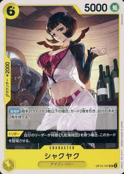 【登場時】相手のライフが3枚以下の場合、カード2枚を引き、自分の手札2枚を捨てる。 【トリガー】自分のリーダーが特徴《九蛇海賊団》を持つ場合、このカードを登場させる。