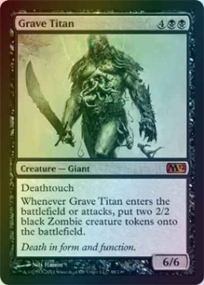 Deathtouch Whenever Grave Titan enters the battlefield or attacks, create two 2/2 black Zombie creature tokens.