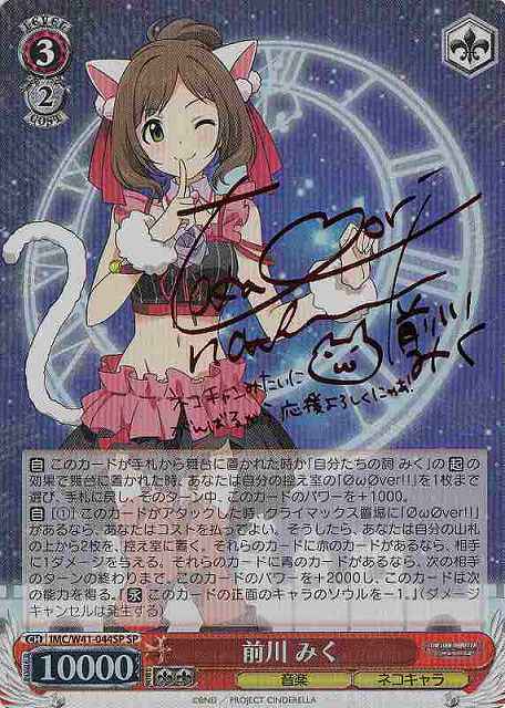 【自】 このカードが手札から舞台に置かれた時か「自分たちの詞 みく」の【起】の効果で舞台に置かれた時、あなたは自分の控え室の「ΦωΦver!!」を1枚まで選び、手札に戻し、そのターン中、このカードのパワーを+1000。【自】[(1)] このカードがアタックした時、クライマックス置場に「ΦωΦver!!」があるなら、あなたはコストを払ってよい。そうしたら、あなたは自分の山札の上から2枚を、控え室に置く。それらのカードに赤のカードがあるなら、相手に1ダメージを与える。それらのカードに青のカードがあるなら、次の相手のターンの終わりまで、このカードのパワーを+2000し、このカードは次の能力を得る。『【永】 このカードの正面のキャラのソウルを-1。』(ダメージキャンセルは発生する)