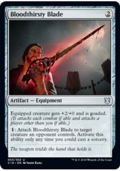 {1}: Attach Bloodthirsty Blade to target creature an opponent controls. Activate this ability only any time you could cast a sorcery.