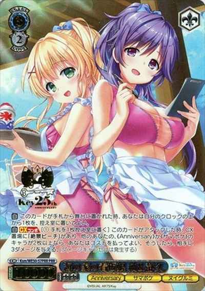 【自】 このカードが手札から舞台に置かれた時、あなたは自分のクロックの上から1枚を、控え室に置いてよい。 【自】【CXコンボ】[(1) 手札を1枚控え室に置く] このカードがアタックした時、CX置場に「絶景ビーチ」があり、他のあなたの、《Anniversary》か《サマポケ》のキャラが2枚以上なら、あなたはコストを払ってよい。そうしたら、相手に3ダメージを与える。(ダメージキャンセルは発生する)