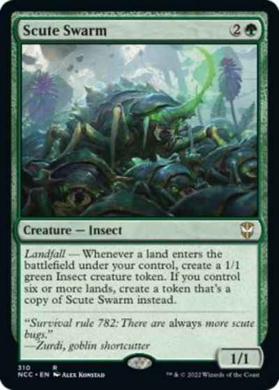Landfall --- Whenever a land enters the battlefield under your control, create a 1/1 green Insect creature token. If you control six or more lands, create a token that's a copy of Scute Swarm instead.