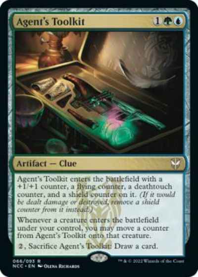 クリーチャー1体があなたのコントロール下で戦場に出るたび、あなたは工作員の道具箱の上にあるカウンター1個をそのクリーチャーの上に動かしてもよい。