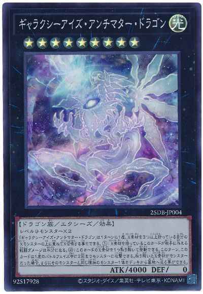 レベル9モンスター×2 「ギャラクシーアイズ・アンチマター・ドラゴン」は1ターンに1度、X素材を3つ以上持っている自分のXモンスターの上に重ねてX召喚する事もできる。(1):X素材を持っているこのカードが相手に与える戦闘ダメージは半分になる。(2):このカードのX素材を1つ取り除いて発動できる。このターン、このカードは1度のバトルフェイズ中に2回までモンスターに攻撃できる。取り除いたX素材がモンスターだった場合、さらにそのモンスターと同じ種族のモンスター1体をデッキから墓地へ送る事ができる。