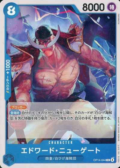 【ブロッカー】 【登場時】自分のデッキの上から1枚を公開し、そのカードが『白ひげ海賊団』を含む特徴を持つ場合、カード2枚を引き、自分の手札1枚を捨てる。