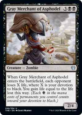 When Gray Merchant of Asphodel enters the battlefield, each opponent loses X life, where X is your devotion to black. You gain life equal to the life lost this way. (Each {B} in the mana costs of permanents you control counts toward your devotion to black.)
