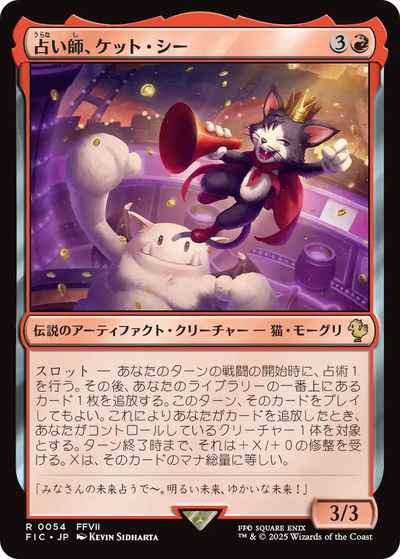 スロッ-あなたのターンの戦闘の開始時に、占術1を行う。その後、あなたのライブラリーの一番上にあるカード1枚を追放する。このターン、そのカードをプレイしてもよい。これによりあなたがカードを追放したとき、あなたがコントロールしているクリーチャー1体を対象とする。ターン終了時まで、それは+X/+0の修整を受ける。Xは、そのカードのマナ総量に等しい。