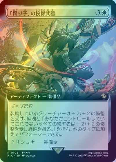 装備しているクリーチャーは+2/+2の修整を受け、絆魂と「あなたがコントロールしていてこれでないすべての統率者は+2/+2の修整を受け絆魂を得る。」を持ち、他のタイプに加えてパフォーマー(Performer)である。