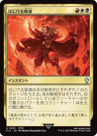 はじける破滅は各対戦相手にそれぞれ2点のダメージを与える。各対戦相手はそれぞれ、自分がコントロールするクリーチャーの中で最も高いパワーを持つクリーチャーを1体生け贄に捧げる。