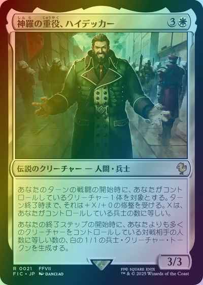 あなたの終了ステップの開始時に、あなたよりも多くのクリーチャーをコントロールしている対戦相手の人数に等しい数の、白の1/1の兵士クリーチャー・トークンを生成する。