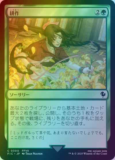あなたのライブラリーから基本土地カード最大2枚を探し、公開し、そのうち1枚をタップ状態で戦場に出し、他をあなたの手札に加え、その後ライブラリーを切り直す。