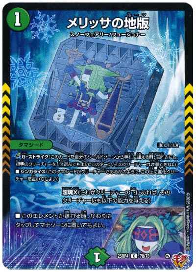 G・ストライク(このカードを自分のシールドゾーンから手札に加える時、表向きにし、相手のクリーチャーを1体選んでもよい。このターン、そのクリーチャーは攻撃できない)シンカライズ(このタマシードがクリーチャーであるかのように、この上に進化クリーチャーを置いてもよい)~超魂X(これがクリーチャーの下にあれば、そのクリーチャーにも以下の能力を与える)~このエレメントが離れる時、かわりにタップしてマナゾーンに置いてもよい。