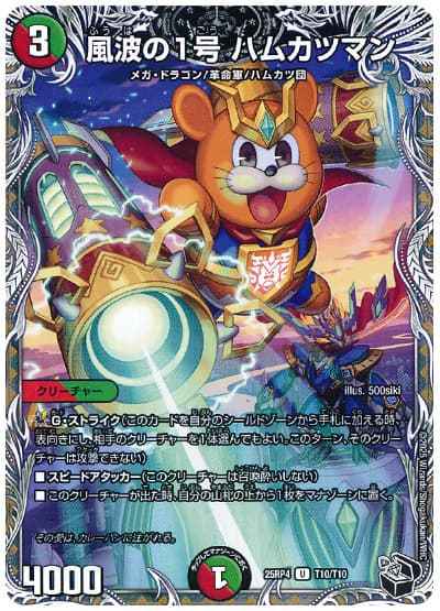 G・ストライク(このカードを自分のシールドゾーンから手札に加える時、表向きにし、相手のクリーチャーを1体選んでもよい。このターン、そのクリーチャーは攻撃できない)スピードアタッカー(このクリーチャーは召喚酔いしない)このクリーチャーが出た時、自分の山札の上から1枚をマナゾーンに置く。
