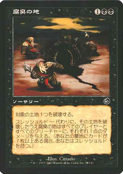 土地1つを対象とし、それを破壊する。 スレッショルド ― あなたの墓地にカードが7枚以上ある場合、代わりに、その土地を破壊するとともに、腐臭の地は各プレイヤーと各クリーチャーに、それぞれ1点のダメージを与える。