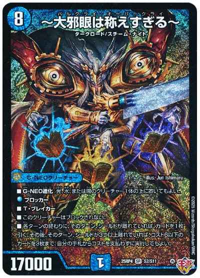 G-NEO進化:光、水、または闇のクリーチャー1体の上に置いてもよい。ブロッカーT・ブレイカーこのクリーチャーはブロックされない。各ターンの終わりに、そのターン、シールドが離れていれば、カードを1枚引く。その後、そのターン、シールドが3つ以上離れていれば、コスト6以下のカードを3枚まで、自分の手札からコストを支払わずに実行してもよい。
