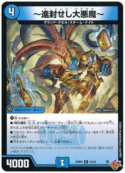 S・トリガーNEO進化:光、水、または闇のクリーチャーの1体の上に置いてもよい。(カードが下にあれば、これをNEO進化クリーチャーとして扱う)このクリーチャーが出た時、このターンに出た相手のクリーチャーをすべて、持ち主の手札に戻す。相手のクリーチャーは出たターン、攻撃できない。