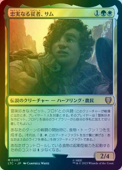 《冒険好きなホビット、フロド/Frodo, Adventurous Hobbit》との共闘(このクリーチャーが戦場に出たとき、プレイヤー1人を対象とする。そのプレイヤーは《冒険好きなホビット、フロド》を自分のライブラリーから自分の手札に加えて切り直してもよい。) あなたのターンの戦闘の開始時に、食物(Food)トークン1つを生成する。(それは、「(2),(T),このアーティファクトを生け贄に捧げる:あなたは3点のライフを得る。」を持つアーティファクトである。) あなたがコントロールしている食物の起動型能力を起動するためコストは(1)少なくなる。