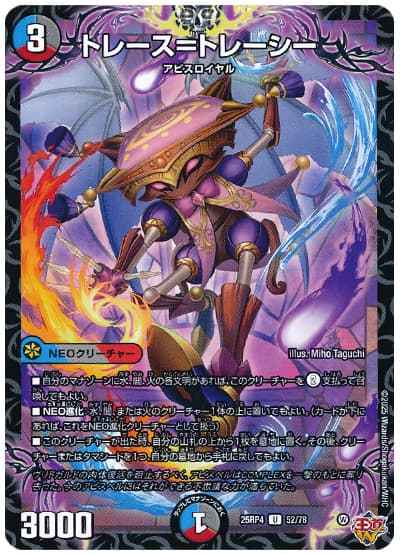 自分のマナゾーンに水、闇、火の各文明があれば、このクリーチャーを[無色(2)]支払って召喚してもよい。NEO進化:水、闇、または火のクリーチャー1体の上に置いてもよい。(カードが下にあれば、これをNEO進化クリーチャーとして扱う)このクリーチャーが出た時、自分の山札の上から1枚を墓地に置く。その後、クリーチャーまたはタマシードを1つ、自分の墓地から手札に戻してもよい。