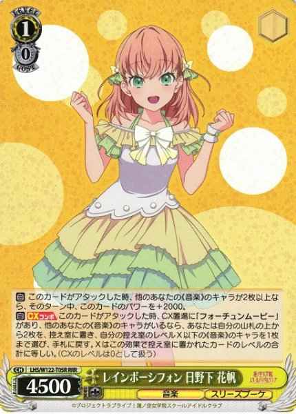 【自】 このカードがアタックした時、他のあなたの《音楽》のキャラが2枚以上なら、そのターン中、このカードのパワーを+2000。 【自】【CXコンボ】 このカードがアタックした時、CX置場に「フォーチュンムービー」があり、他のあなたの《音楽》のキャラがいるなら、あなたは自分の山札の上から2枚を、控え室に置き、自分の控え室のレベルX以下の《音楽》のキャラを1枚まで選び、手札に戻す。Xはこの効果で控え室に置かれたカードのレベルの合計に等しい。(CXのレベルは0として扱う)