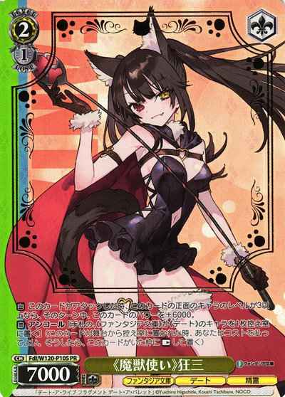 【自】 このカードがアタックした時、このカードの正面のキャラのレベルが3以上なら、そのターン中、このカードのパワーを+6000。【自】 アンコール [手札の、《ファンタジア文庫》か《デート》のキャラを1枚控え室に置く] (このカードが舞台から控え室に置かれた時、あなたはコストを払ってよい。そうしたら、このカードがいた枠に【レスト】して置く)