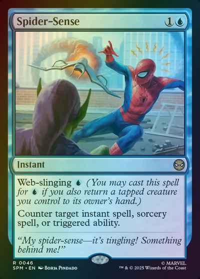 Web-slinging {U} (You may cast this spell for {U} if you also return a tapped creature you control to its owner's hand.) Counter target instant spell, sorcery spell, or triggered ability.