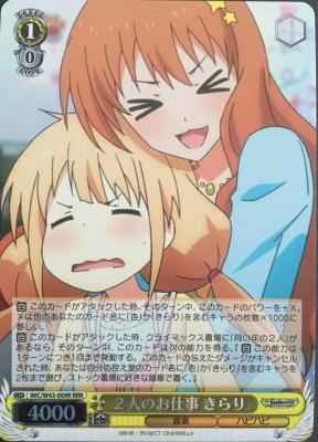 【自】 このカードがアタックした時、そのターン中、このカードのパワーを+X。Xは他のあなたのカード名に「杏」か「きらり」を含むキャラの枚数×1000に等しい。 【自】 このカードがアタックした時、クライマックス置場に「同い年の2人」があるなら、そのターン中、このカードは次の能力を得る。『【自】 この能力は1ターンにつき1回まで発動する。このカードの与えたダメージがキャンセルされた時、あなたは自分の控え室のカード名に「杏」か「きらり」を含むキャラを2枚まで選び、ストック置場に好きな順番で置く。』