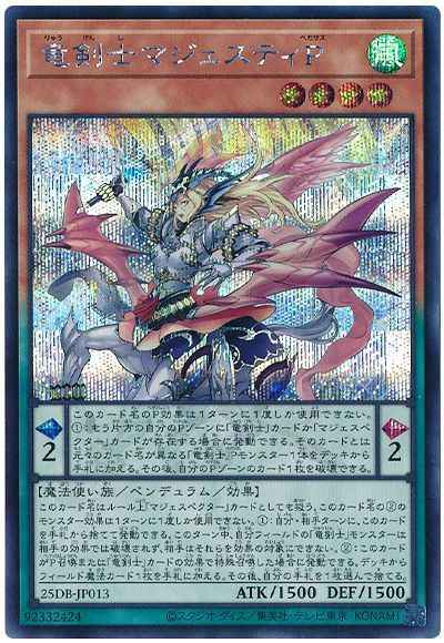 このカード名はルール上「マジェスペクター」カードとしても扱う。このカード名の(2)のモンスター効果は1ターンに1度しか使用できない。(1):自分・相手ターンに、このカードを手札から捨てて発動できる。このターン、自分フィールドの「竜剣士」モンスターは相手の効果では破壊されず、相手はそれらを効果の対象にできない。(2):このカードがP召喚または「竜剣士」カードの効果で特殊召喚した場合に発動できる。デッキからフィールド魔法カード1枚を手札に加える。その後、自分の手札を1枚選んで捨てる。