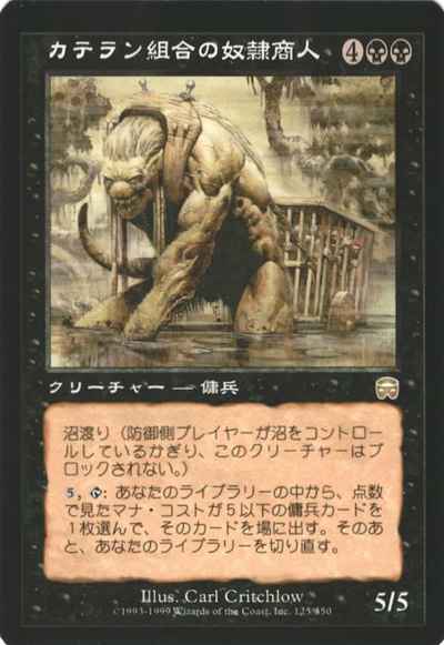 沼渡り(このクリーチャーは、防御プレイヤーが沼(Swamp)をコントロールしているかぎりブロックされない。) (5),(T):あなたのライブラリーから、点数で見たマナ・コストが5以下の傭兵(Mercenary)パーマネント・カードを1枚探し、それを戦場に出す。その後、あなたのライブラリーを切り直す。