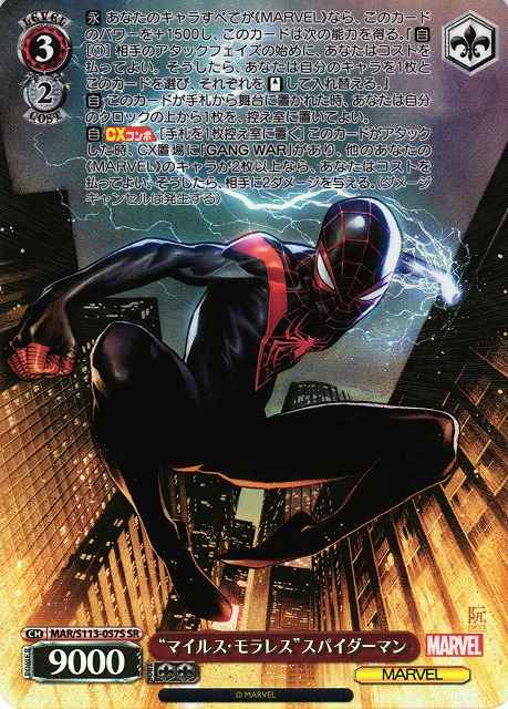【永】 あなたのキャラすべてが《MARVEL》なら、このカードのパワーを+1500し、このカードは次の能力を得る。『【自】[(1)] 相手のアタックフェイズの始めに、あなたはコストを払ってよい。そうしたら、あなたは自分のキャラを1枚とこのカードを選び、それぞれを【スタンド】して入れ替える。』 【自】 このカードが手札から舞台に置かれた時、あなたは自分のクロックの上から1枚を、控え室に置いてよい。 【自】【CXコンボ】[手札を1枚控え室に置く] このカードがアタックした時、CX置場に「GANG WAR」があり、他のあなたの《MARVEL》のキャラが2枚以上なら、あなたはコストを払ってよい。そうしたら、相手に2ダメージを与える。(ダメージキャンセルは発生する)