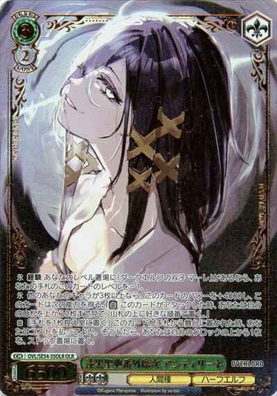 【永】 経験 あなたのレベル置場に「ダークエルフの双子 マーレ」があるなら、あなたの手札のこのカードのレベルを-1。 【永】 他のあなたのキャラが3枚以上なら、このカードのパワーを+4000し、このカードは次の能力を得る。『【自】 このカードがアタックした時、あなたは自分の山札を上から2枚まで見て、山札の上に好きな順番で置く。』 【自】[手札を1枚控え室に置く] このカードが手札から舞台に置かれた時、あなたはコストを払ってよい。そうしたら、あなたは自分のクロックの上から1枚を、ストック置場に置く。