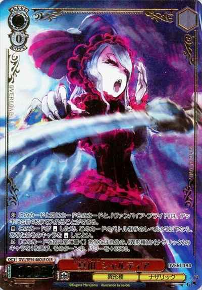 【永】 このカードと同じカード名のカードと、「ヴァンパイア・ブライド」は、デッキに合計4枚まで入れることができる。 【自】 このカードが【リバース】した時、このカードのバトル相手のレベルが0以下なら、あなたはそのキャラを【リバース】してよい。 【起】[このカードを控え室に置く] あなたは自分の、《異形種》か《ナザリック》のキャラを1枚選び、そのターン中、パワーを+2500。