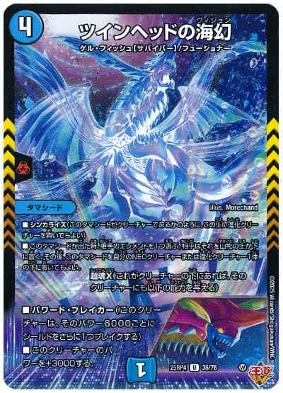 シンカライズ(このタマシードがクリーチャーであるかのように、この上に進化クリーチャーを置いてもよい)このタマシードが出た時、相手のエレメントを1つ選ぶ。相手はそれを山札の上か下に置く。その後、このタマシードを自分のNEOクリーチャーまたは進化クリーチャーの下に置いてもよい。~超魂X(これがクリーチャーの下にあれば、そのクリーチャーにも以下の能力を与える)~パワード・ブレイカー(このクリーチャーは、そのパワー6000ごとにシールドをさらに1つブレイクする)このクリーチャーのパワーを+3000する。